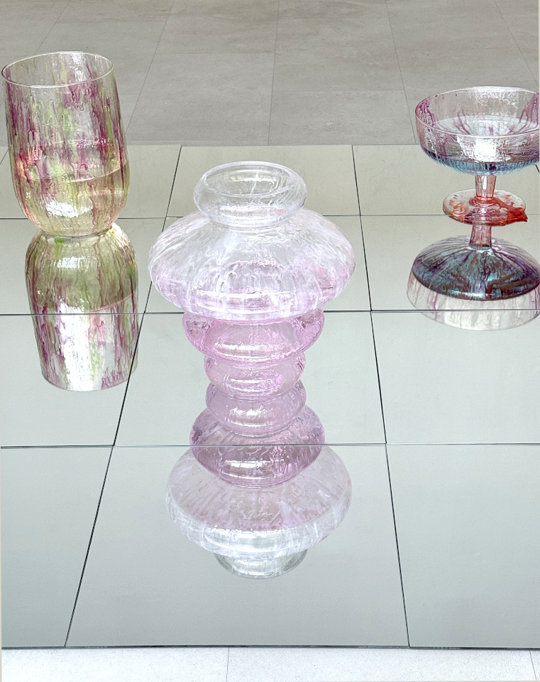 Lana Haga's installation explores the essence of womanhood, free from the limitations of stereotypes and societal expectations. She crafts a surreal landscape with fluid-filled glass vessels set on mirrored floors, each symbolizing a woman’s capacity to nurture and sustain herself while holding onto her agency. The vessels’ reflections form "impossible" shapes, representing a perpetual source of energy and redefining femininity as a reservoir of boundless potential.