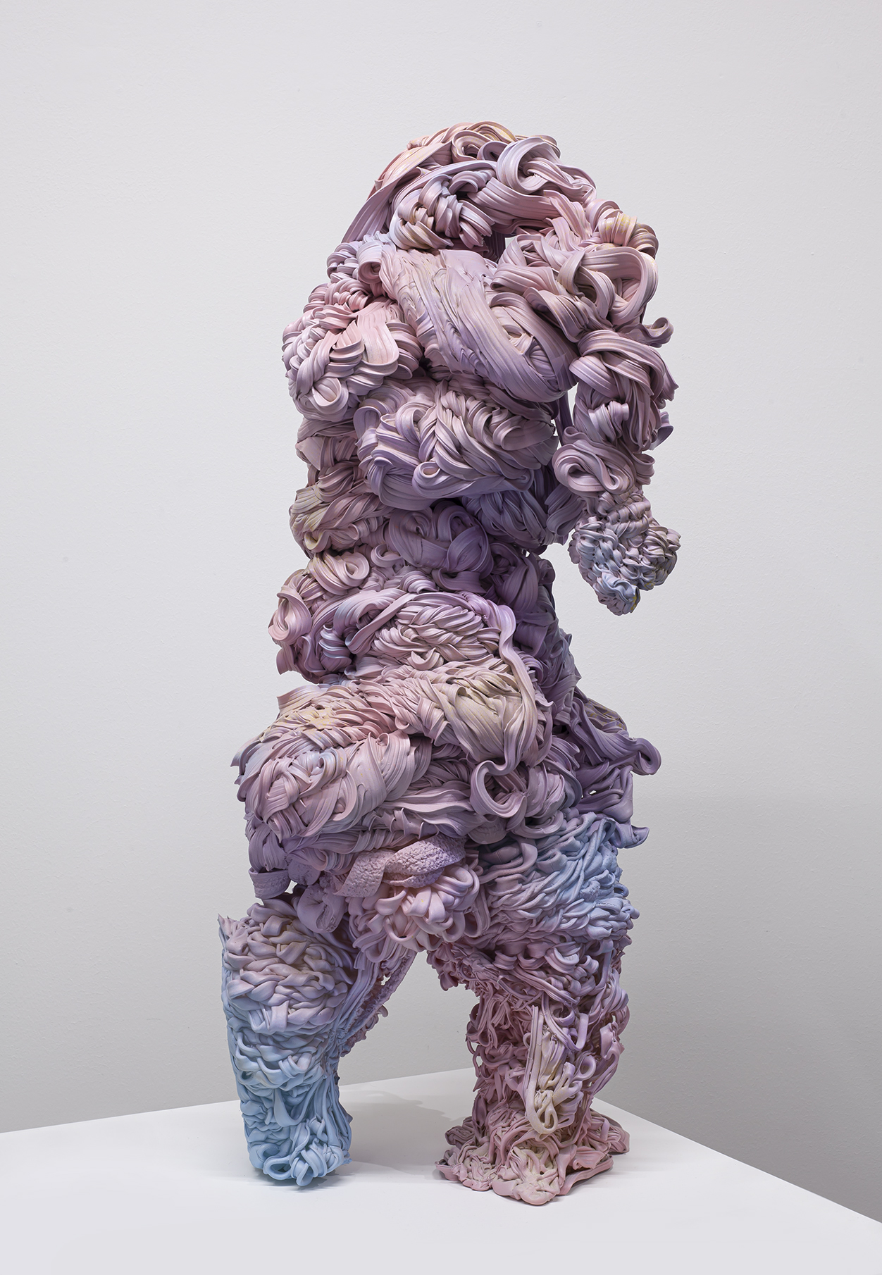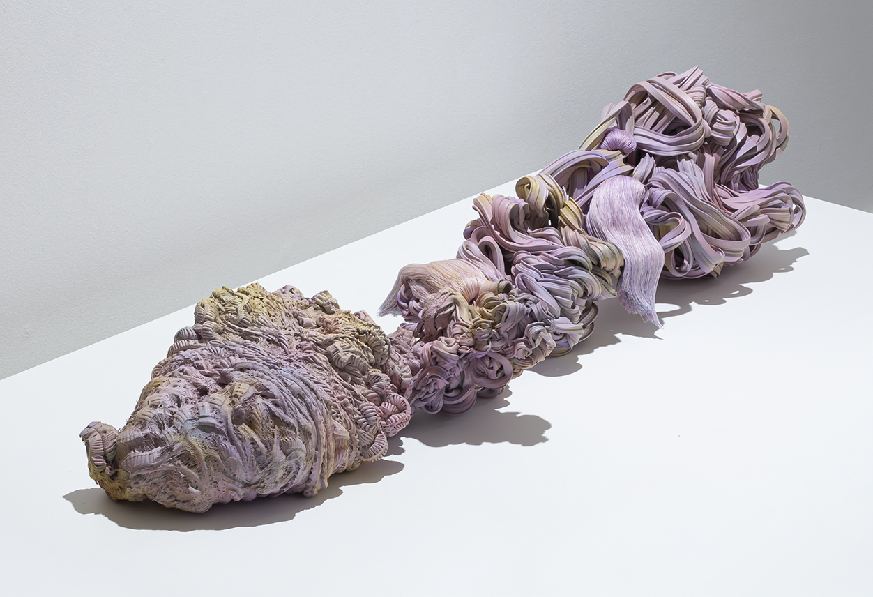 The free-standing sculptures in the Rebirth series are made from extruded industrial waste plastic. Their form comes from the interaction between machine, artist and chance. In her sculptures, Haga presents plastic – a material that originates from organic matter that is billions of years old – as a mark of long-term geological development as well as an impression of human time. The sculptures are like fossil records of a substance that nature produced but that has been consumed and abandoned by humankind. Beyond their underlying critical stance, Haga’s sculptures appear as creatures that present possible life forms and waver between the representational and the non-representational, evidence of forms that life can take as it adapts to changes.